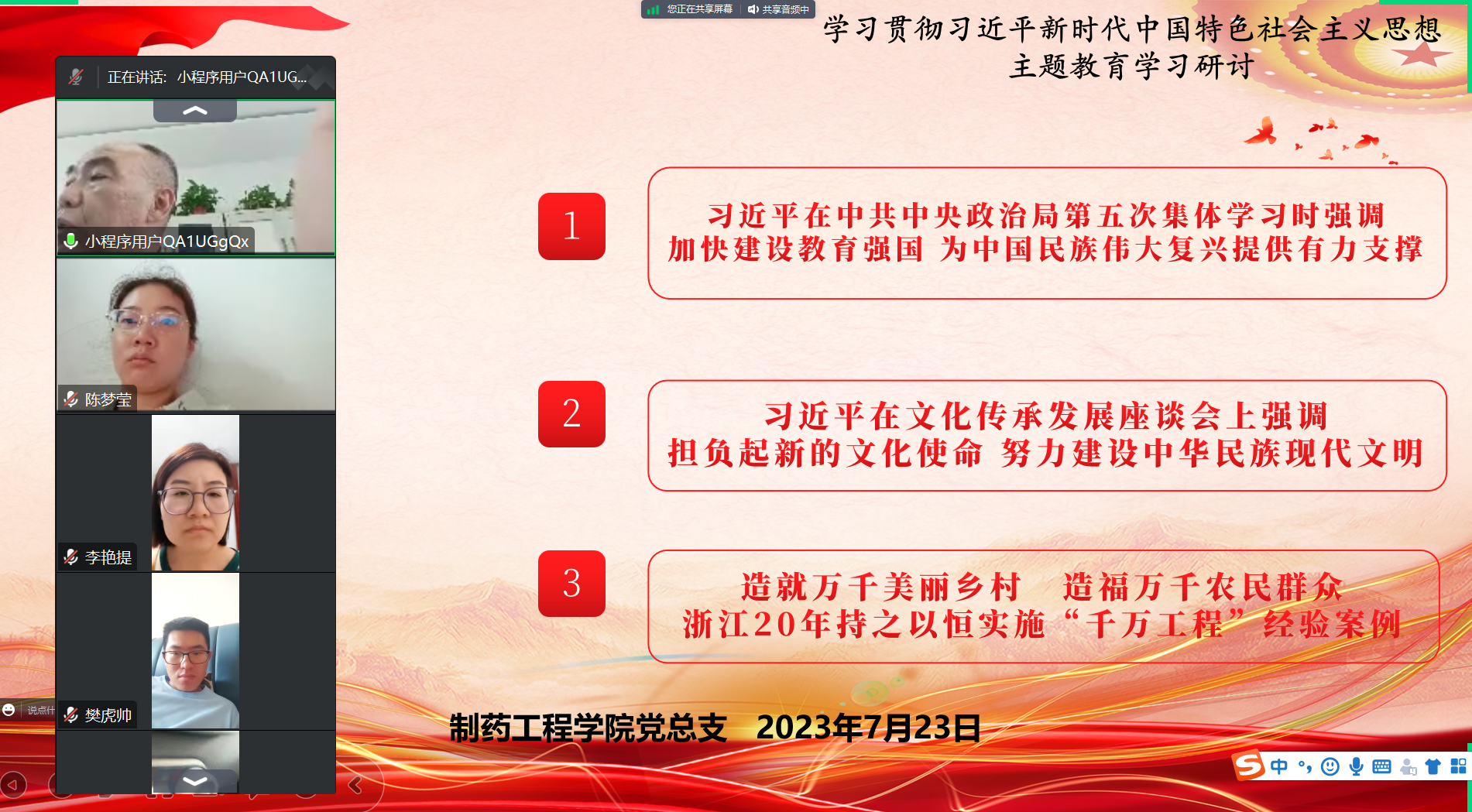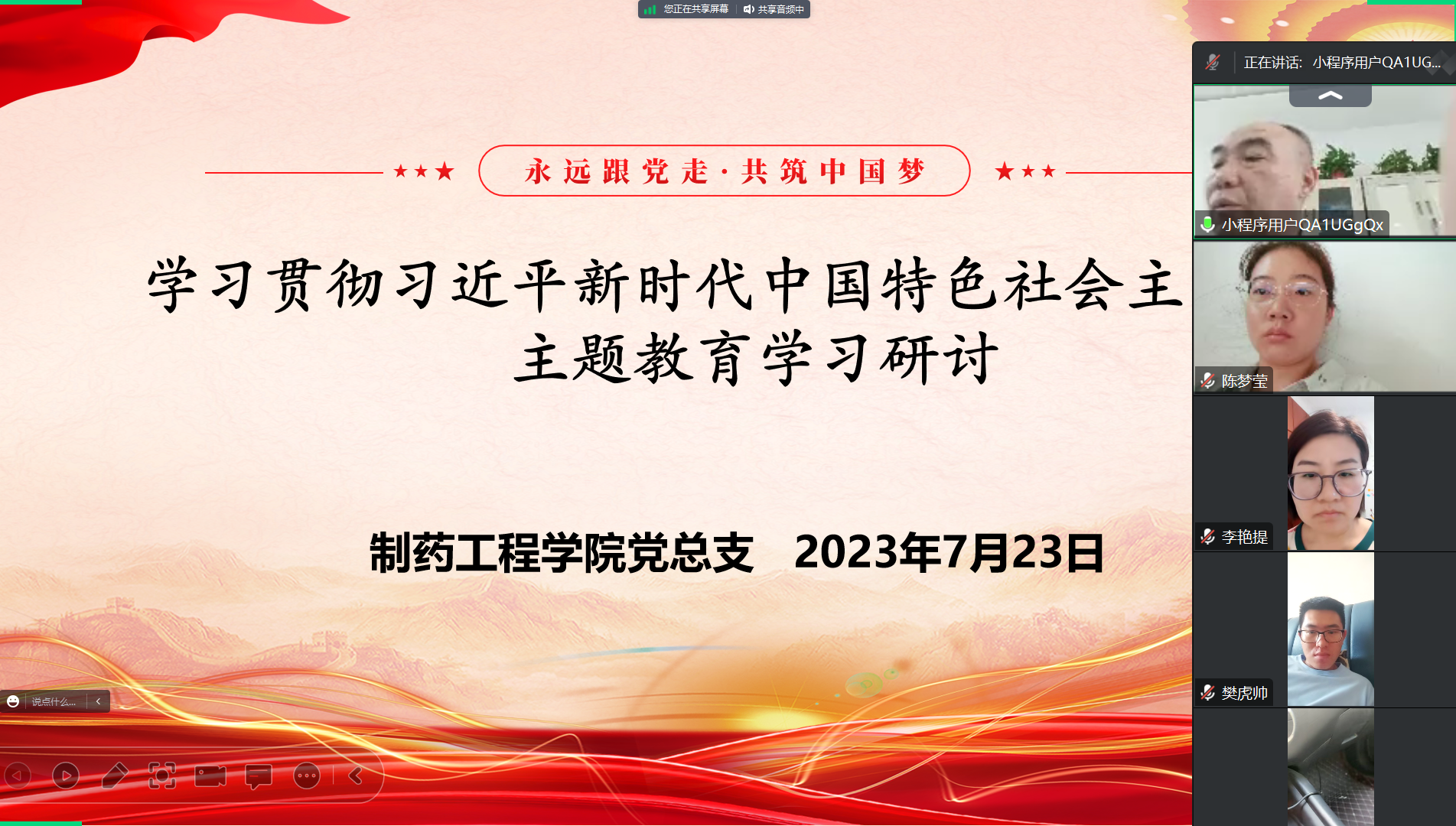 为贯彻落实党的二十大精神,不断推动学习贯彻习近平新时代中国特色社会主义思想主题教育走深走实,制药工程学院党总支于2023年7月23日下午召开主题教育学习交流研讨会,会议由党总支书记窦传斌主持,学院全体教职工通过腾讯会议参加了学习研讨。