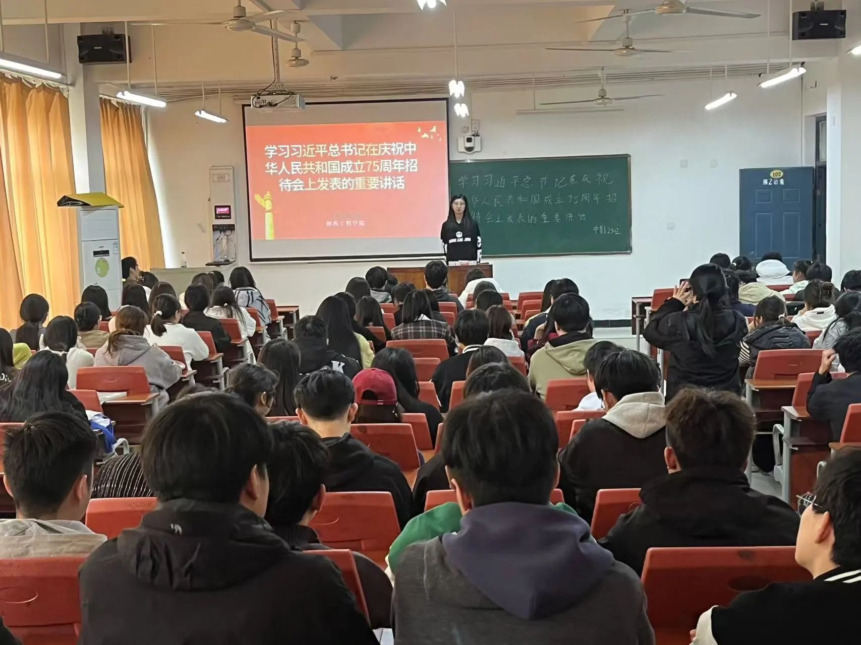 在主题团课上,各班团支书首先为同学们解读了习近平总书记在庆祝中华人民共和国成立75周年招待会上的重要讲话,带领同学们回顾了中华人民共和国成立75年来的艰苦历程与取得的诸多成就,并强调了习近平总书记提出的新时代新征程下党和国家的中心任务,着重指出习近平总书记重要讲话精神对于当代大学生的指导意义。