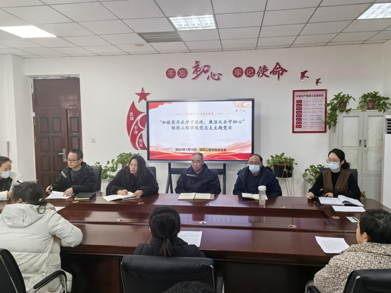 为深入学习贯彻党的二十大、党的二十届三中全会精神,持续推动党的纪律学习教育走深走实,拧紧“思想关”、守好“廉洁心”、绷紧“作风弦”,2025年1月16日,制药工程学院党总支在301党员活动室开展“知敬畏存戒律守底线,廉洁从业守初心”主题党日暨春节前廉洁教育集中谈话活动,活动由党总支书记窦传斌主持,学院全体党员参加。