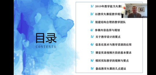 陈教授分别从2019年教学能力大赛情况、以教学大赛促教学规范、组建结构合理的教学团队、参赛内容选择与规划、教学设计的要点、信息化技术与教学资源的应用、课堂实录视频片段的基本要求、模拟实际教学的规则与要点、备战教学大赛的建议等九个方面进行了讲解,对观众提出的问题进行了回答。