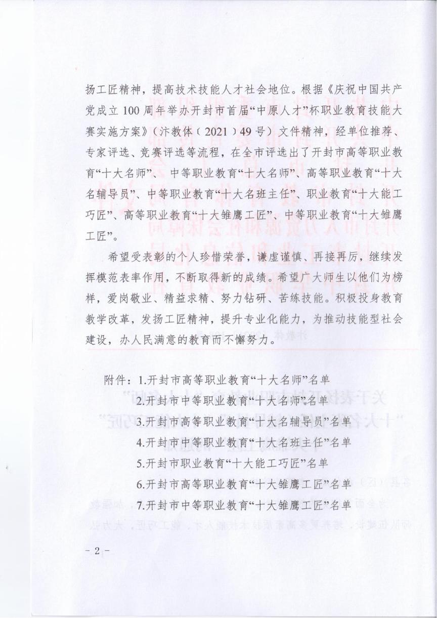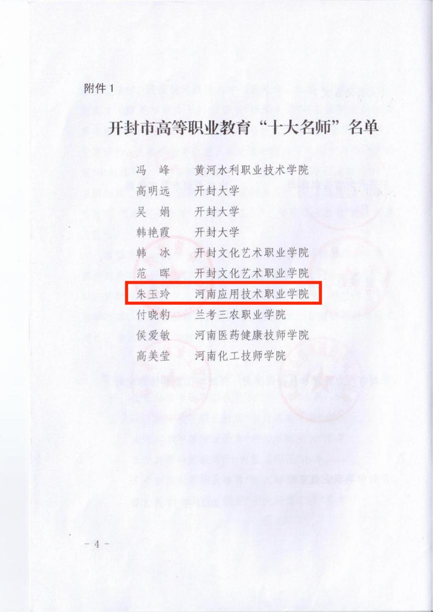 2021年12月16日,由中共开封市委组织部主办、开封市教育体育局承办的首届“中原人才”杯职业教育技能大赛颁奖仪式在汴梁小宋城举行,我校制药工程学院朱玉玲老师经过层层选拔和严格考核,被评为开封市高等职业教育“十大名师”荣誉称号。