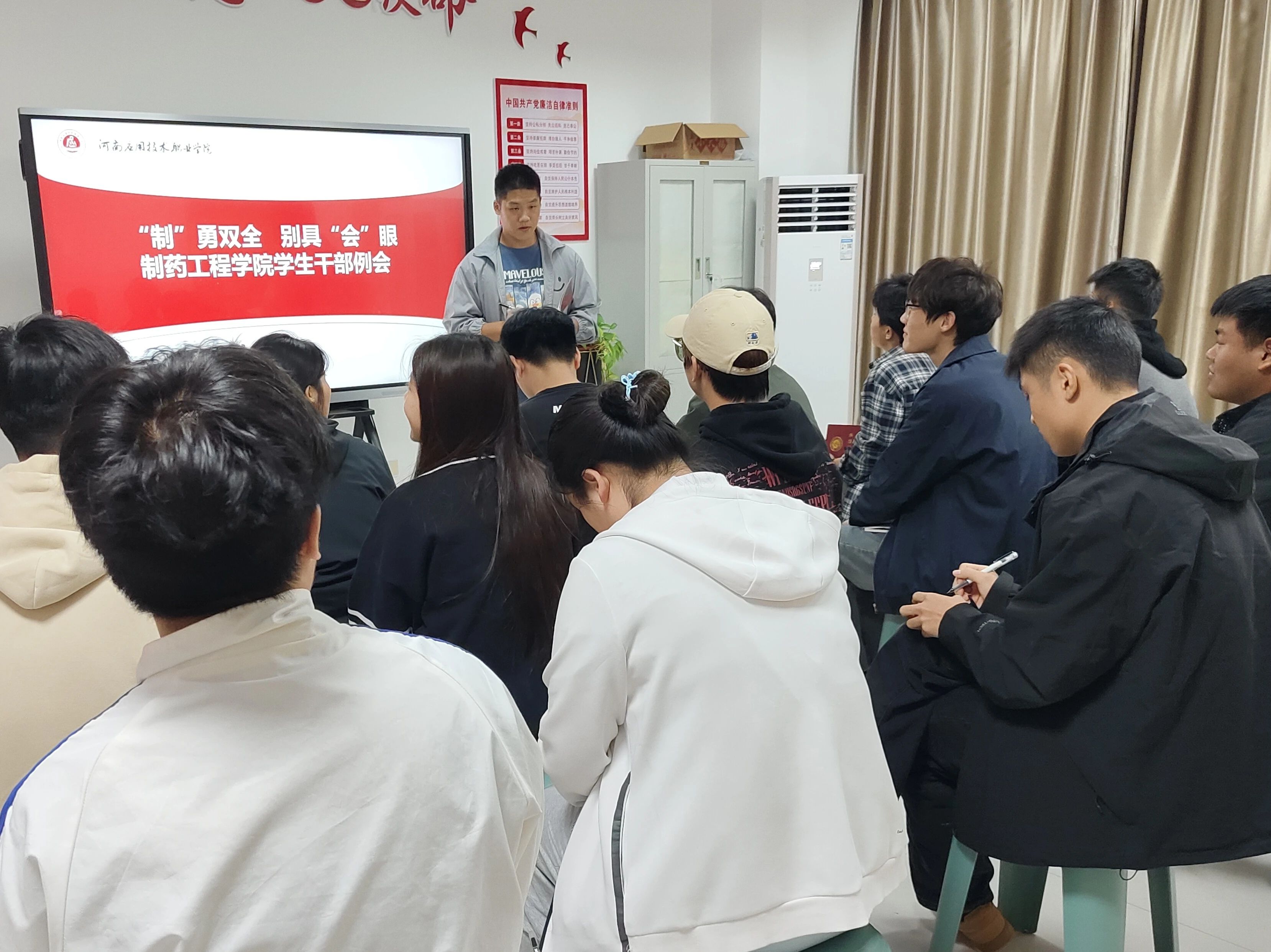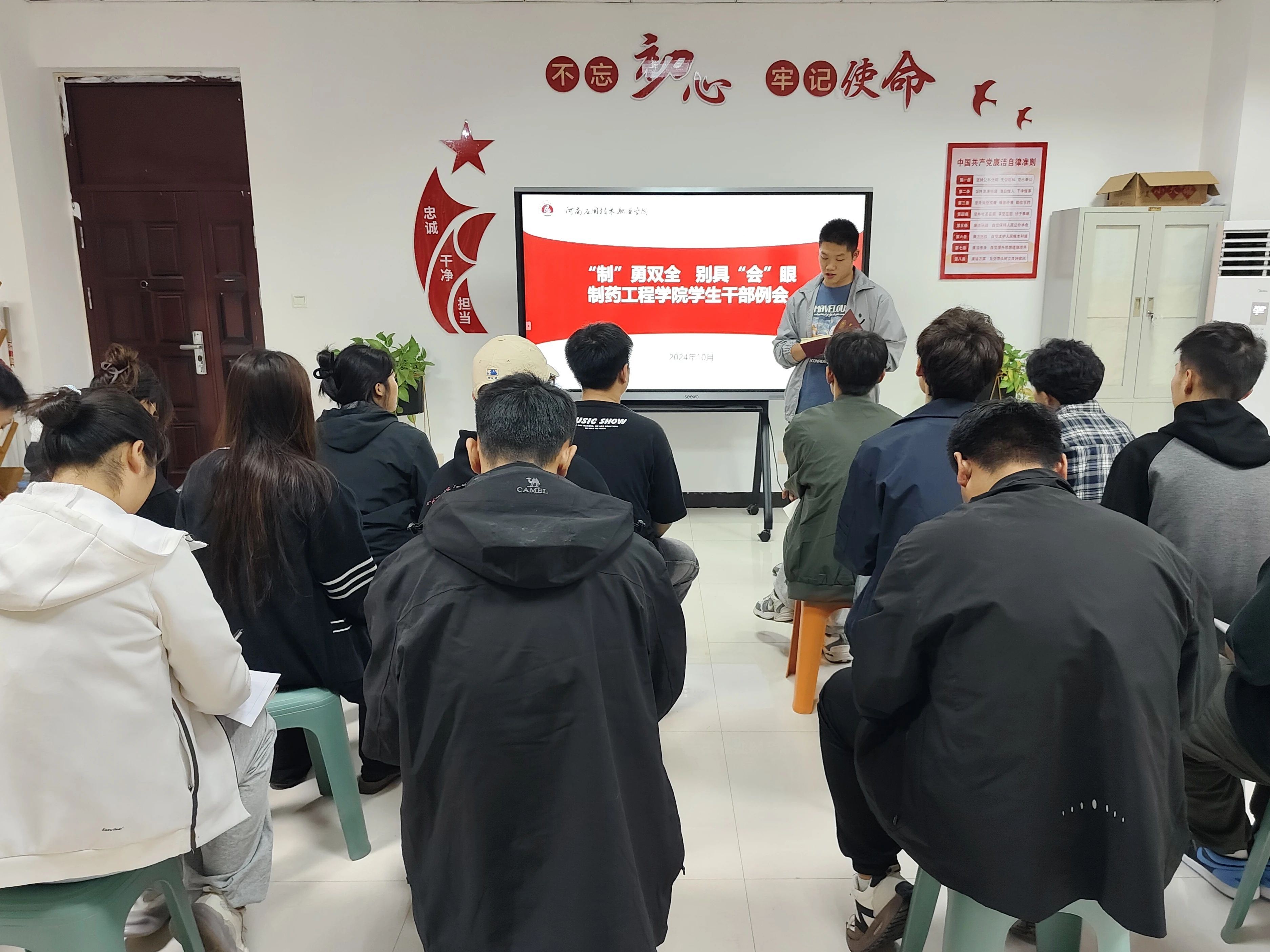 为进一步增强学生会干部自我管理,自我服务意识,提高学生会干部的工作能力和服务水平,以及接下来的工作事务的安排。制药工程学院于2024年10月14日下午18:30在行政楼301召开学生会干部例会。会议由制药工程学院学生会主席团成员郝鑫航主持,学生会主席团及各部门部长、副部长参加本次会议。