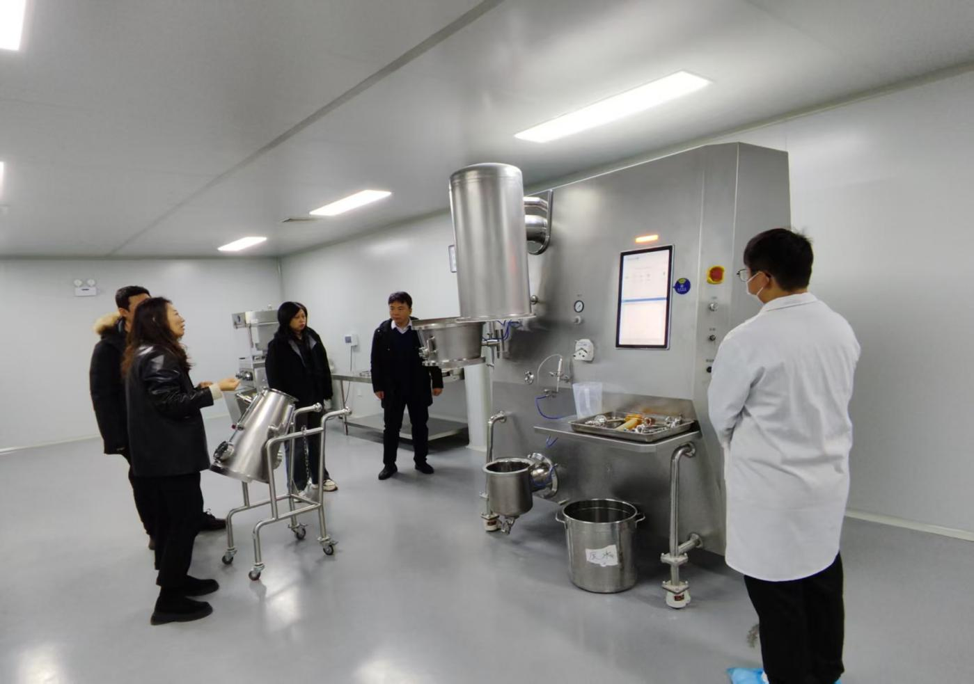 在高莉丽的带领下,来访嘉宾参观了开云液体、固体制剂生产实训车间及智慧GMP综合实训车间。现代化的生产设备以及标准化的操作流程得到了企业代表的高度认可。双方重点围绕“胃肠充盈造影颗粒试剂”的工艺优化展开探讨,技术团队现场演示了流化床制粒技术在原料处理中的应用,针对颗粒粒度、流动性、溶化性等关键指标进行了参数优化与实验验证。