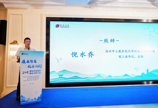 8月29日15:30,绍兴市上虞区杭州湾综合管理办公室党工委书记、主任倪水乔登台致辞,围绕绍兴制药产业规划布局、政策扶持方向,阐释政校企协同对产业升级的关键意义,为合作锚定方向。