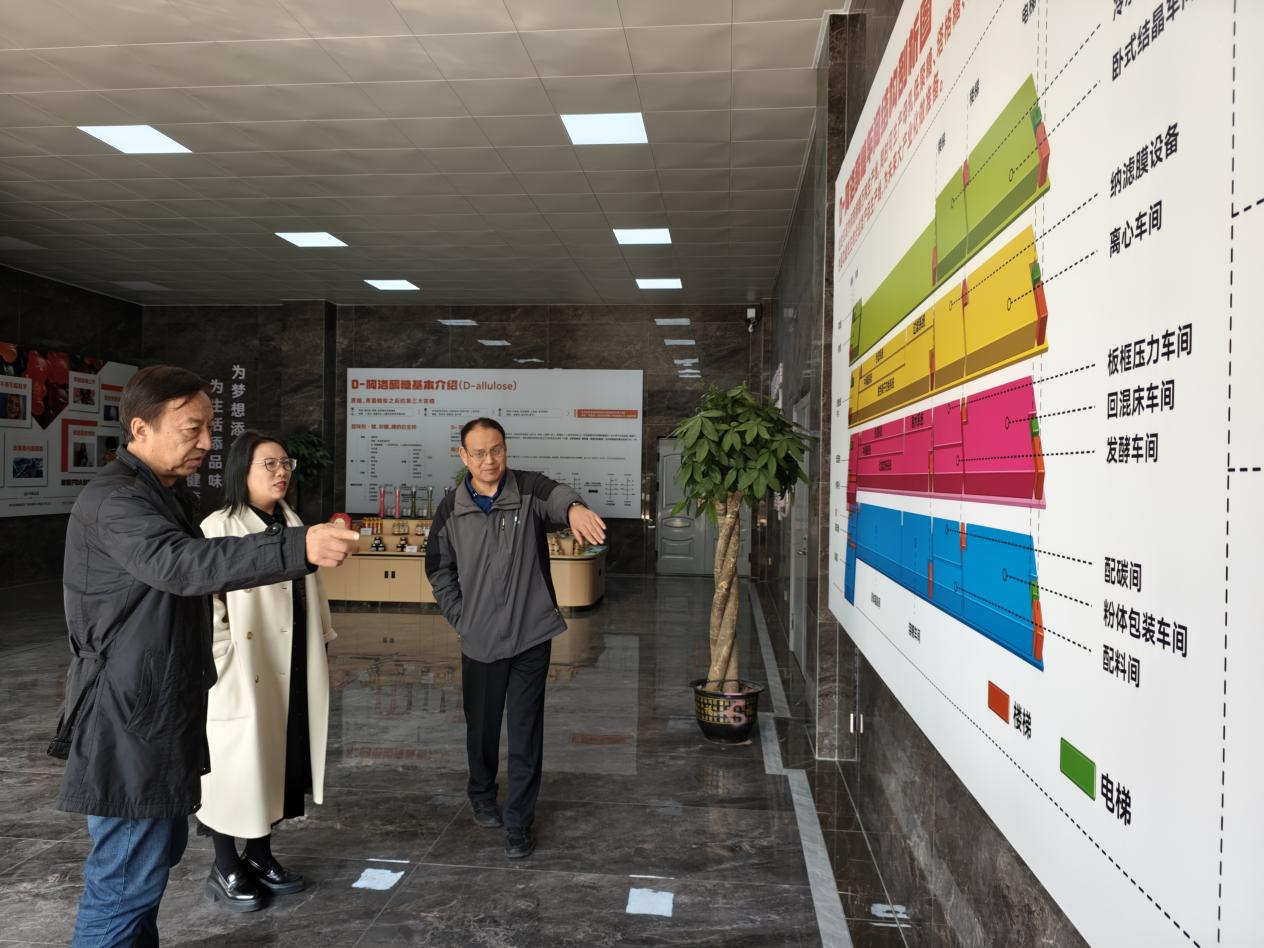 在企业人力资源总监许恒的陪同下,王湘妍一行深入考察了D-阿洛酮糖专属生产线、企业研发中心,重点观摩了“生物酶转化-结晶纯化-质量检测”全流程生产体系。在天然植物提取体验馆,企业技术人员详解了栀子黄、姜黄素等300余种产品的产业化应用历程。